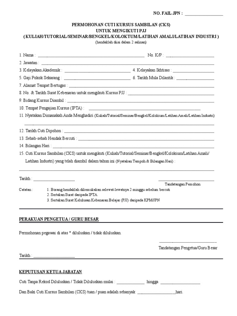 Related : Borang Cuti Kursus Sambilan - Borang Cuti Kursus Sambilan Pjj / Download & view borang cuti kursus sambilan as pdf for free..